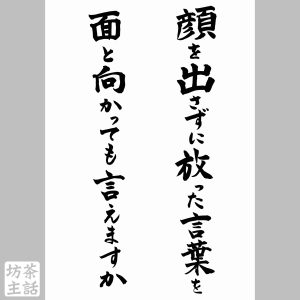 お寺の掲示板 251123 2025年11月23日(日) お寺の掲示板に貼った今週のことばです。 顔を出さずに放った言葉を 面と向かっても言えますか ・ ・ ・ ・ ・ ・ ・ ・ ・ ネットに載っている記事への書き込みのコメントは 自分を明かさないので好きなように書き込めますが 相手と向かい合うと好き放題には言いづらいですね。 今週のテーマは「相手の存在を想像する」です。 シェア Tweet