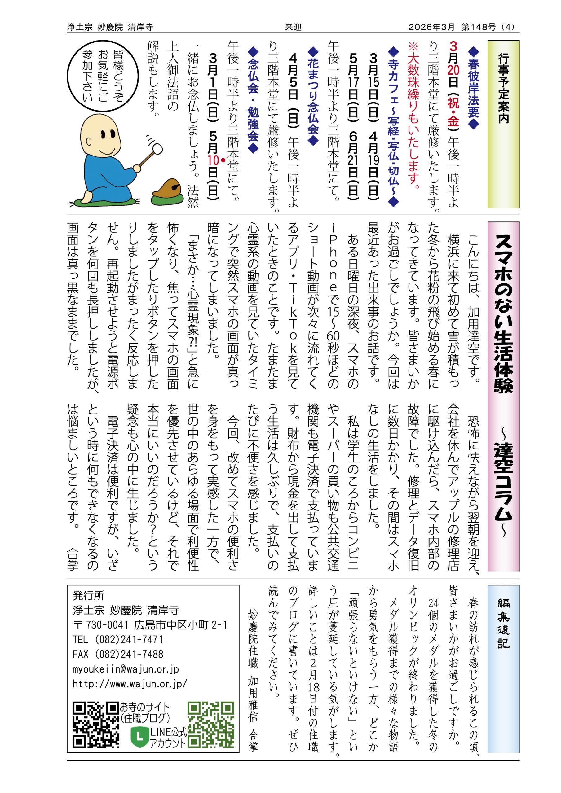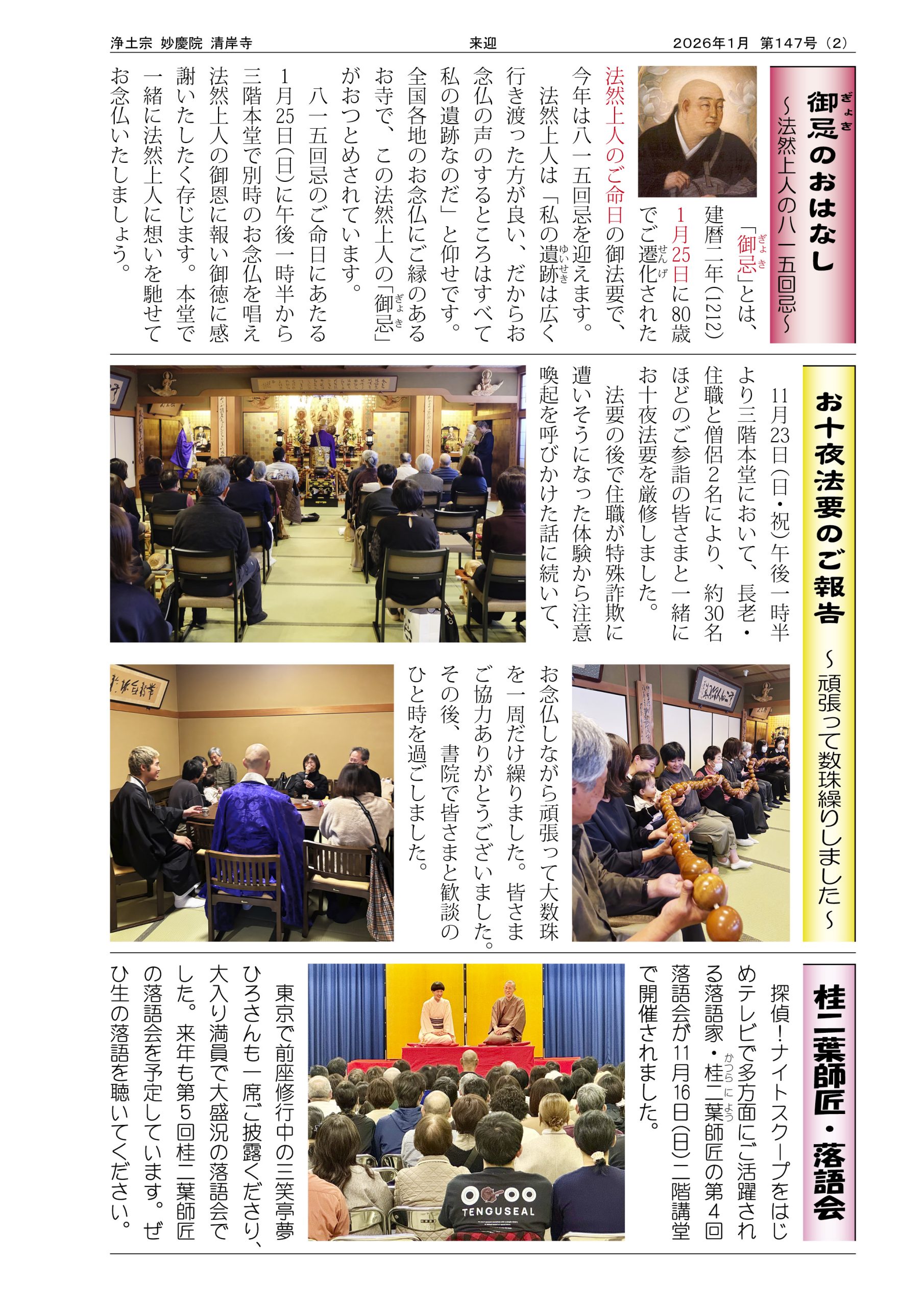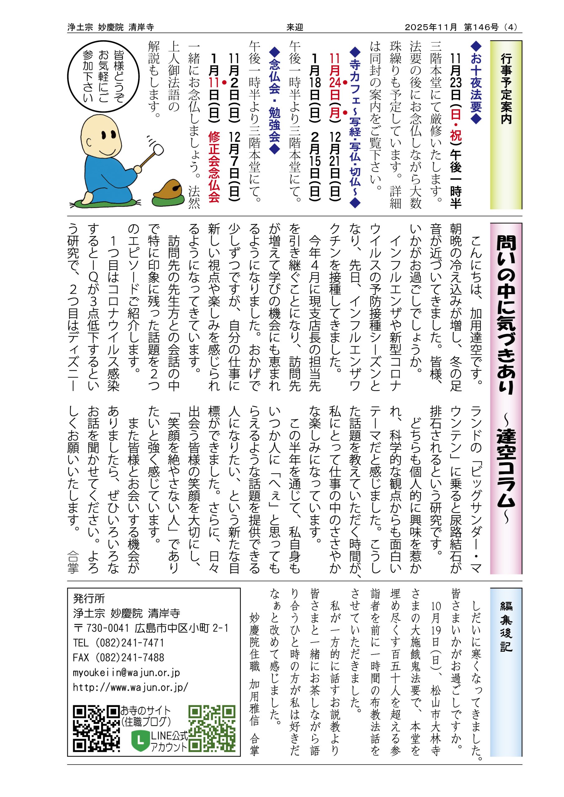 奇数月発行の、お寺の話題や行事のご案内等、お寺に関する耳寄り情報を掲載している寺報です。 お寺の3階納骨堂にて無料でお配りしていますので、ぜひ手にとってご覧ください。